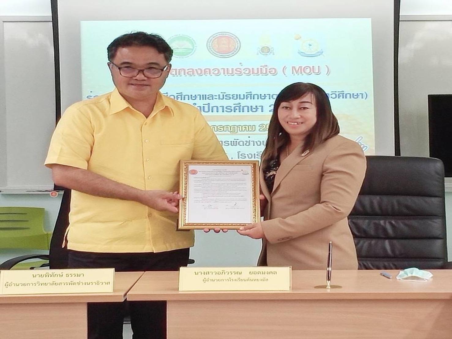 MOU วิทยาลัยสารพัดช่างนราธิวาสโรงเรียนตันหยงมัส บันทึกข้อตกลงความร่วมมือ (MOU) ในการแสดงเจตนารมณ์ การร่วมดำเนินการ โครงการเรียนร่วมหลักสูตรอาชีวศึกษาตอนปลาย (ทวิศึกษา) ในสถานศึกษา (สังกัด สพม.15) มีจุดประสงค์เพื่อเพิ่มโอกาสทางการศึกษาด้านอาชีวศึกษา แก่นักเรียนโรงเรียนตันหยงมัส โดยมี ดร.อภิวรรณ ยอดมงคล ผู้อำนวยการโรงเรียนตันหยงมัส และนายพิทักษ์ ธรรมา ผู้อำนวยการวิทยาลัยสารพัดช่างนราธิวาสร่วมลงนามความร่วมมือ