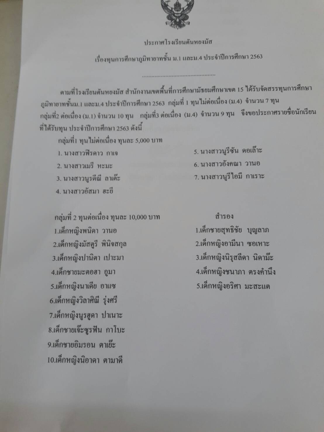 ประกาศทุนภูมิทายาทนักเรียนชั้นม.1และม.4 ประจำปีการศึกษา 2563